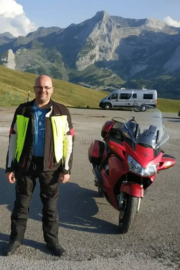 À la recherche d’un meilleur confort pour de longs trajets, je roule maintenant en Honda Pan European ST1300 de 2002 que j’ai acheté d’occasion : elle avait alors près de 100 000 km. Un véritable canapé sur route : bulle haute, une selle incroyable, un réhausseur de guidon font que j’arrive à destination sans aucune fatigue ! Bref, j’en suis très satisfait !